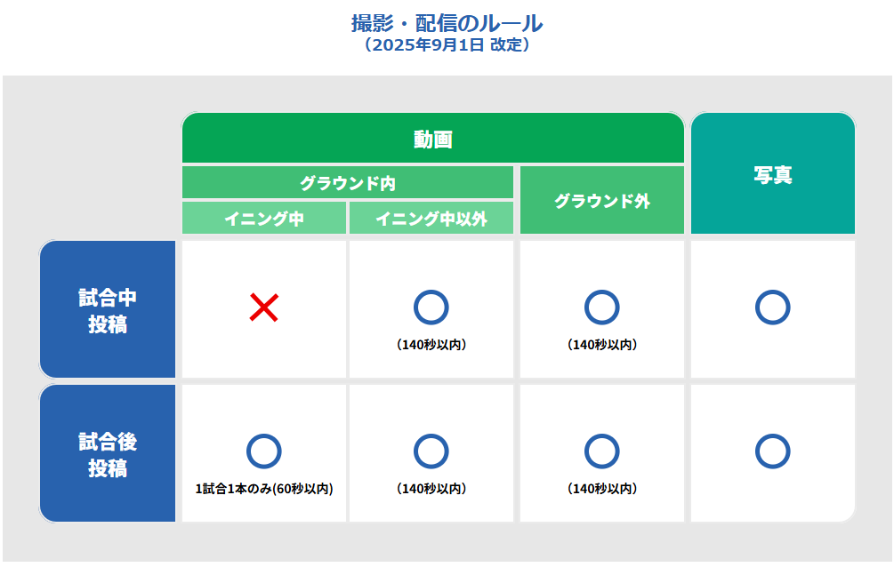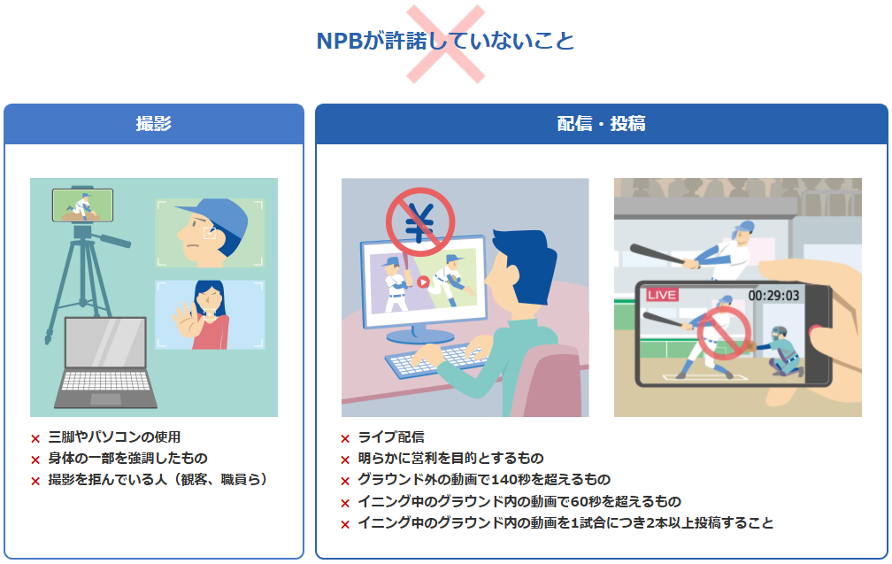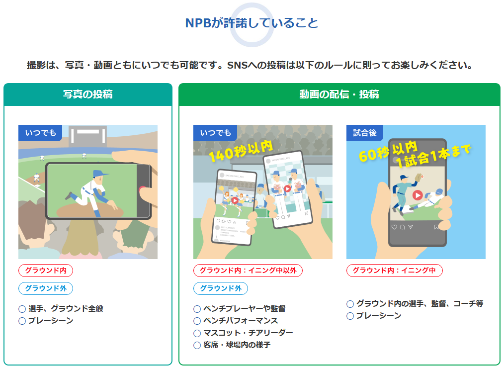 詳しい規程は公式サイトをご確認ください: 写真・動画等の撮影及び配信・送信規程 | 日本野球機構